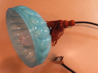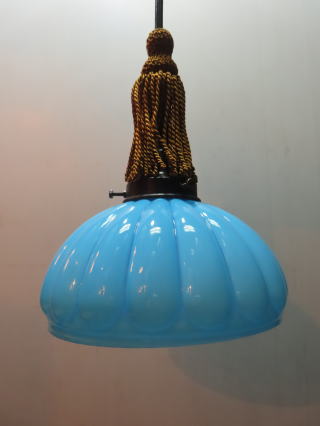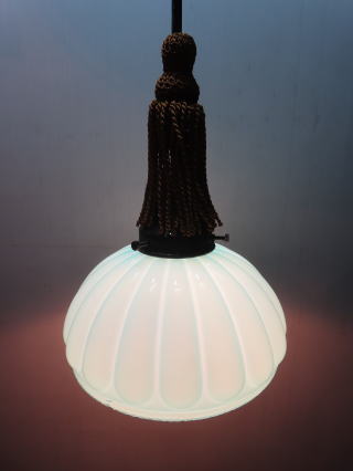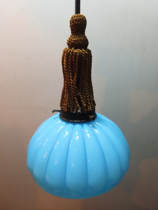 特別に「希少」な照明器具が出ました ●08012101 高さ:ガラス11.5cm 横幅:20.7cm 重さ:1kg コード長さ:71cm 材質:青色ガラス(つやピカ)・房かざり 在庫:1台 電球:一般球100Wまでお使い頂けます (エコ)LED電球もお使い頂けます 大正・昭和初期製造品 価格:¥60000(税・送料別途) お問い合せメール ![]() ![]() ![]() |