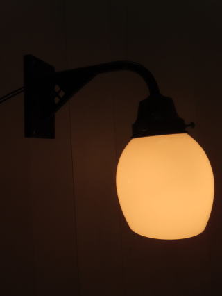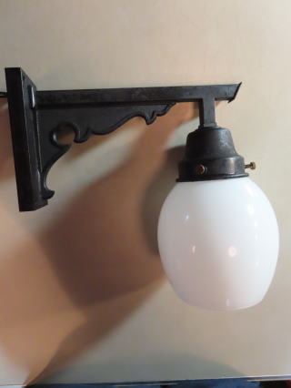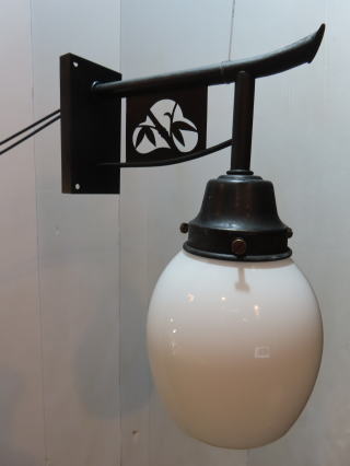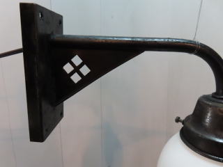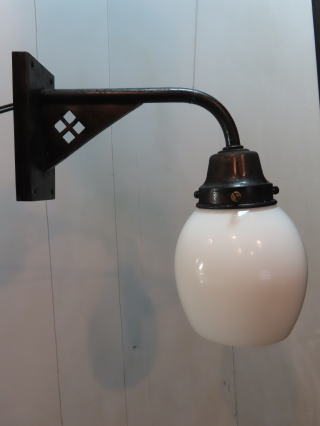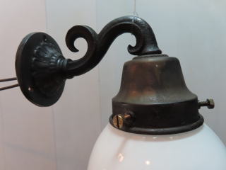 歌舞練場で使われていた 大型の壁付け照明 ●03101106 全体の高さ(ガラスの底から器具頂上まで) 44.6cm 壁からの出っ張り:40.1cm 重さ:2.4kg 材質:真鍮・スリガラス 電球:一般球やLED電球 100Wまでお使い頂けます 在庫:2台(同じものが2台ございます) 大正時代製造品 価格:各¥100000(税・送料別途) お問い合せメール ![]() クサリは装飾の一部で壁に固定するものです ![]() 器具はがっしりとしたつくりです ![]() |