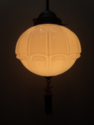 ●07072301 高さ:ガラス17cm 横幅:24.4cm 重さ:1.2kg コード長さ:71cm 材質:乳白ガラス(つやピカ)・房飾り コード吊り 在庫:1台 時代:大正・昭和初期製造品 価格:¥48000(税・送料別途) 電球:一般球100Wまでお使い頂けます (エコ)LED電球もお使い頂けます ![]() ![]() ![]() |