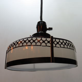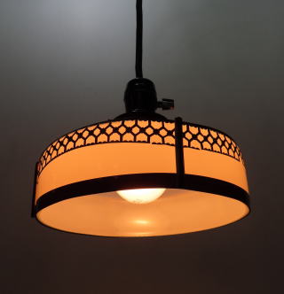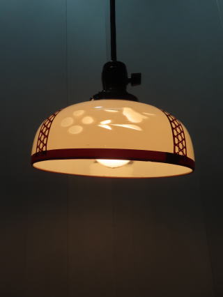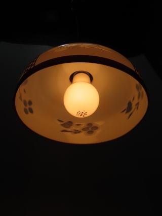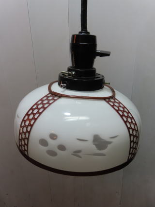 ●06090201 高さ:ガラス10.4cm 横幅:20.5cm 重さ:1kg コード長さ:60cm 材質:乳白ガラス・樹脂飾り 在庫:1台 電球:一般球E-26サイズ100Wまでお使い頂けます (エコ)LED電球もお使い頂けます 価格:¥23000(税・送料別途) お問い合せメール ![]() ガラスのまわりにセルロイドの飾りが貼ってあります ![]() ![]() |
