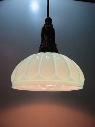 特別に「希少」な照明器具が出ました ●08012101 高さ:ガラス11.5cm 横幅:20.7cm 重さ:1kg コード長さ:71cm 材質:青色ガラス(つやピカ)・房かざり 在庫:1台 電球:一般球100Wまでお使い頂けます (エコ)LED電球もお使い頂けます 大正・昭和初期製造品 価格:¥60000(税・送料別途) お問い合せメール ![]() ![]() ![]() |