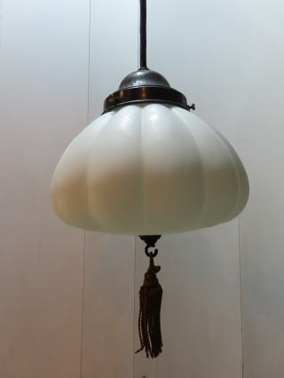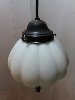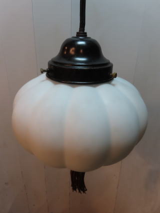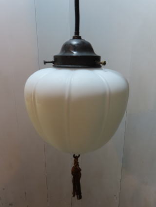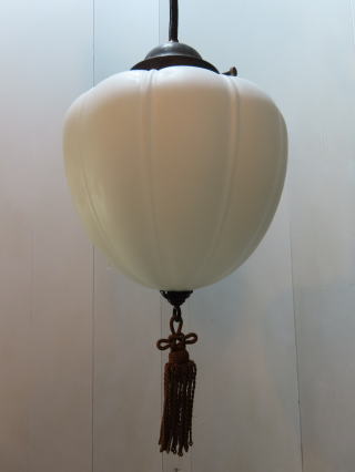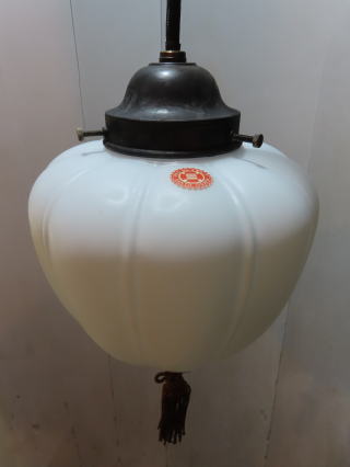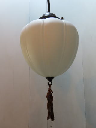 ●07073101 高さ:ガラス17.3cm 横幅:24.5cm 重さ:1.2kg コード長さ:70.5cm 材質:乳白ガラス(つやピカ)・房飾り コード吊り 在庫:1台 時代:大正・昭和初期製造品 価格:¥48000(税・送料別途) 電球:一般球100Wまでお使い頂けます (エコ)LED電球もお使い頂けます ![]() ![]() ![]() |